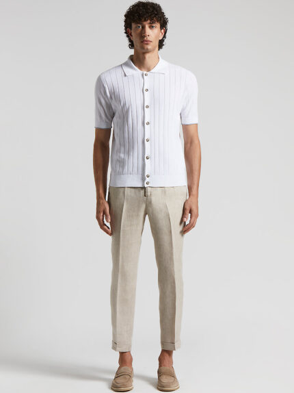 Shirt in pure cotton yarn knitted in a wide, flat rib pattern that enhances the texture.The design features a refined ribbed collar, cuffs and hem, along with short set in sleeves for a clean-cut look…