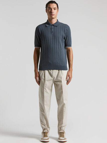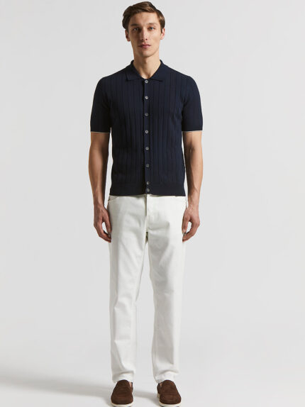Shirt in pure cotton yarn knitted in a wide, flat rib pattern that enhances the texture.The design features a refined ribbed collar, cuffs and hem, along with short set in sleeves for a clean-cut look…
