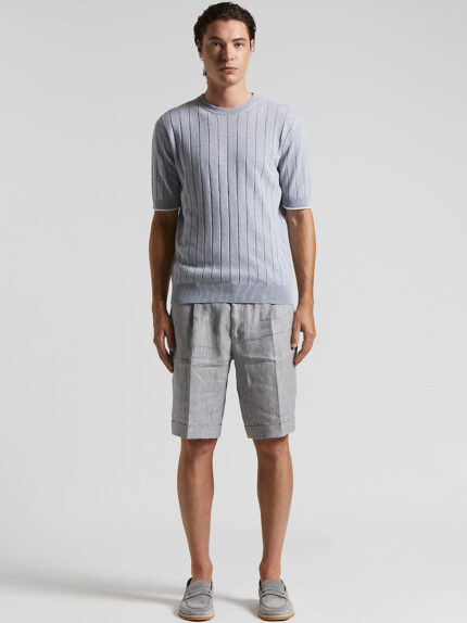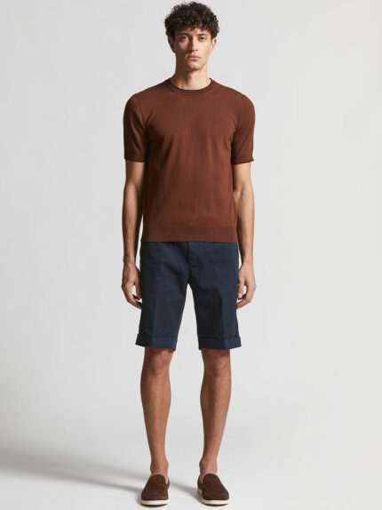 T-shirt in fine pure cotton yarn knitted in stocking stitch to ensure comfort and freshness.The crewneck and ribbed neck, cuffs and hem make it perfect to wear alone or under a jacket for discreet ele…