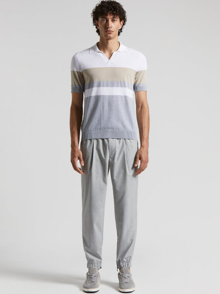 Polo shirt in pure cotton yarn knitted in stocking stitch in colour block stripes that add a modern, distinctive touch.The open buttonless polo shirt collar makes for a smooth, essential design, while…