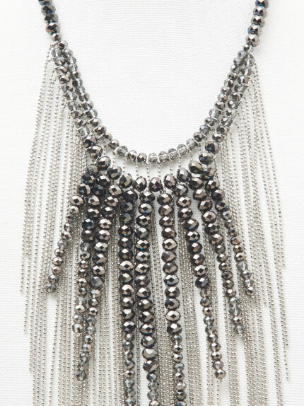 Sculpted elegance takes form in this bib necklace, where the fan effect opens with refined lightness.A sparkling cascade of chains and demi-crystals embellish the design, creating a play of sophistica…