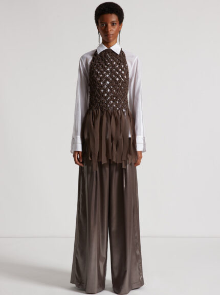 Hand-woven chiffon ribbon top, merging craftsmanship and elegance.The halter neck tied at the back lends a sensual and refined touch, while the fringes on the hem add movement and original flair.Made …