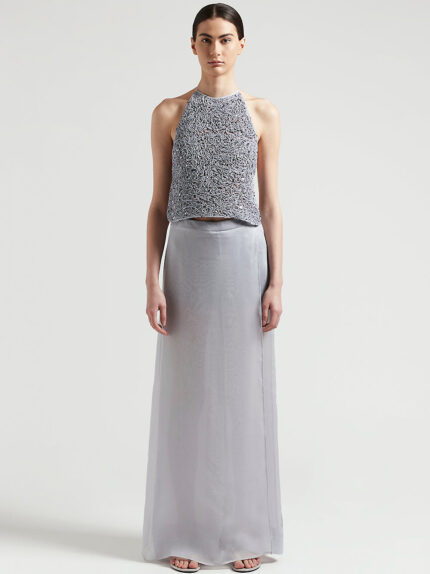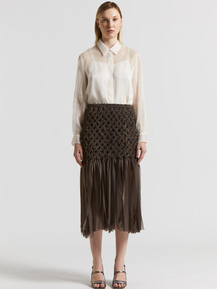 Hand-woven skirt, a unique interpretation of elegance and craftsmanship. Made of ultra-light chiffon, its delicate structure is embellished with fringes on the hem for charming movement.A refined and…