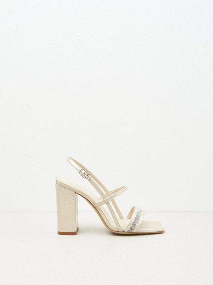 Sandals that blend stylishness and a bold look. Crafted in metallic cloud-effect real leather and featuring a high heel and square toe that accentuate their modern character.Punto Luce chain trim adds…