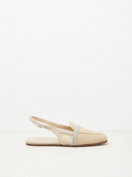 A combination of elegance and sophisticated details – these flat satin slingbacks feature a chain and Punto Luce strip on the upper that adds a touch of discreet sparkle.The suede insert and leather l…