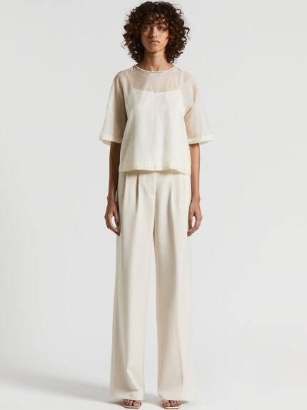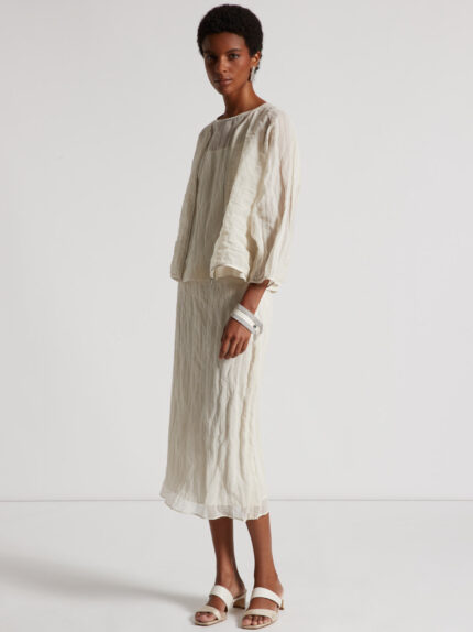 Made of lightweight organza with a refined crepe effect, this blouse combines feminine charm and contemporary style. The delicate fabric offers a unique texture and a sophisticated look.
