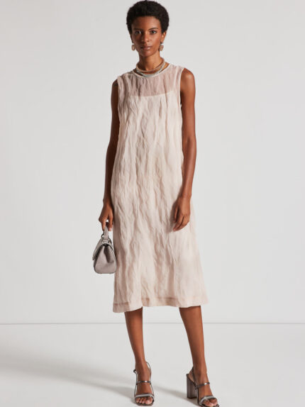 Sleeveless crew neck top in lightweight metallic cotton crushed organza, which gives the fabric a unique textureThe transparency of organza is balanced and made discreet by the slip top.The keyhole op…