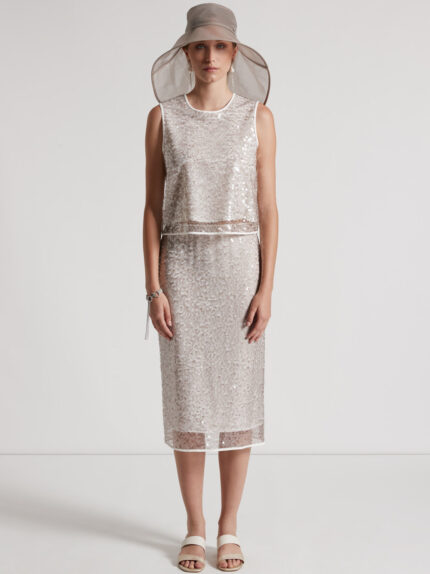 Sleeveless crew neck top in lightweight translucent sequin net that catches the light with a sophisticated sparkle.Lined for comfort, it features a keyhole fastening at the back neckline.The boxy fit…