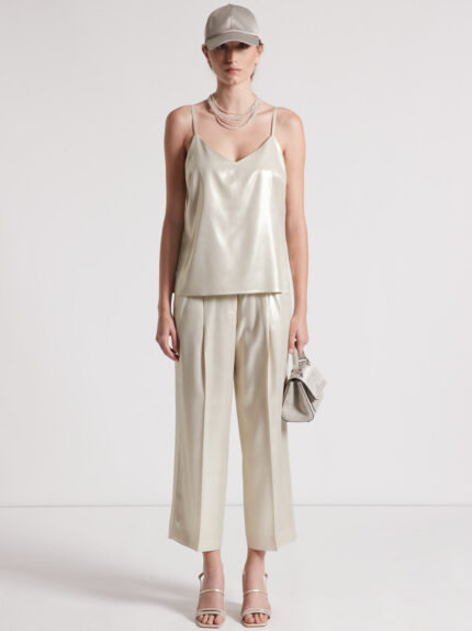 Trousers that combine comfort and style, with pleats that elegantly define the line.Made in fluid laminated viscose twill, the fabric offers a sophisticated sheen and flowy fit.The elasticated back wa…