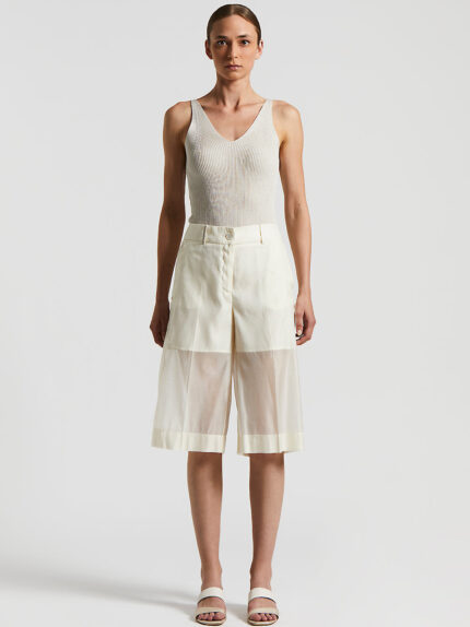 Bermuda shorts in light transparent organza with a crepe effect feature elegant and refined transparency. Lined with opaque shorts, they perfectly balance elegance and a cool feel.The Punto Luce detai…