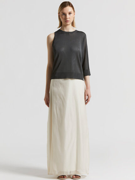 An elegant one-shoulder silhouette characterises this tricot sweater made of lightweight, shiny viscose yarn.Stocking stitch knit creates a clean, contemporary style, while the asymmetric sleeves enha…