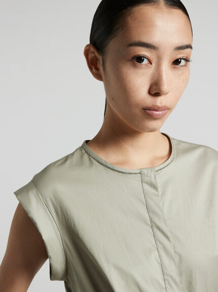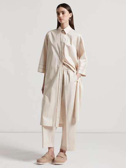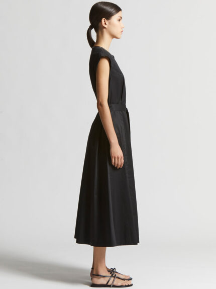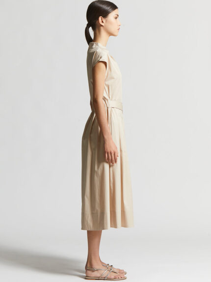 This long dress made of lightweight stretch cotton satin is characterised by its modern and feminine style.The asymmetrical line with cap sleeves gives the garment a modern look, while the crater neck…