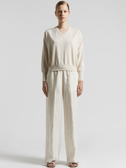 With a design that combines comfort and style, these pure linen trousers are ideal for Spring-Summer 2025. The regular waist with elastic and drawstring at the waist and hem allows for an adjustable f…