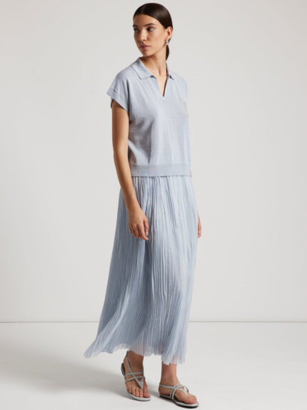 This lightweight stretch cotton satin long skirt is a versatile and elegant piece.Featuring two front pleats and two slash pockets for a practical touch, it has an elegant side slit and a flared line …