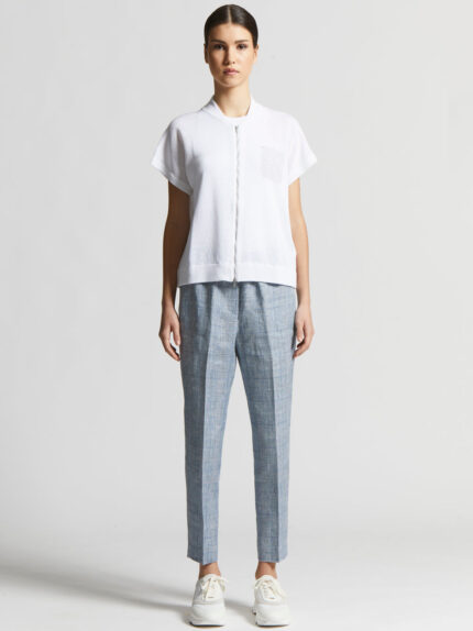 This bomber jacket made of fine linen and cotton yarn feels cool and soft on the skin.The short kimono sleeves and practical visible zip fastening create a modern and versatile style, the ideal choice…
