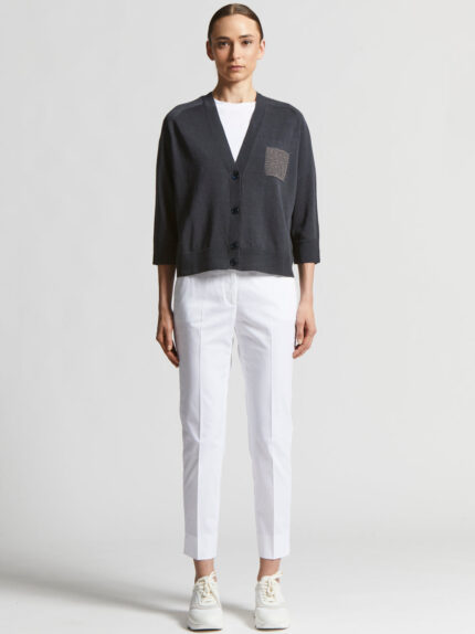 This tricot cardigan features a classic design with timeless charm.Made of cool linen and cotton yarn, it has a loose fit with a deep, feminine V-neckline and the iconic Punto Luce detail on the patch…