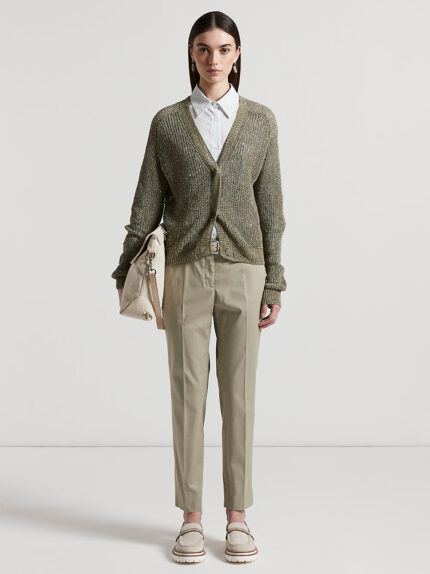This tricot cardigan is made of fine linen yarn and embellished with sequins, which add a touch of class and a delicate glow.Perfect for cool summer evenings, it features a cob stitch pattern that con…