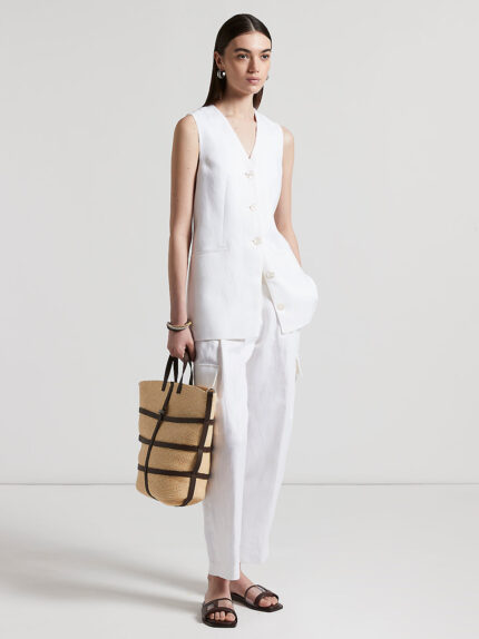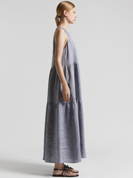 This long dress with cutaway armholes and a round neckline is an example of natural, casual elegance. Made of lightweight pure linen, it gently hugs the figure with a cool effect.The precious details …