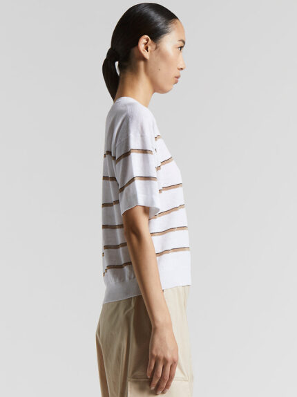 This short-sleeved jersey, made of lightweight linen and cotton crepe yarn, provides a natural cool feel that is perfect for summer.The irregular stripe inserts enriches the design with an original …