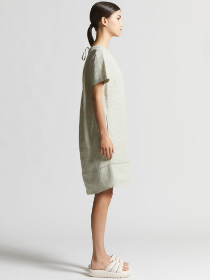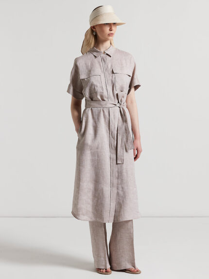 Made of cool pure linen, this sleeveless long dress is a perfect synthesis of elegance and comfort.The V-neckline, embellished with a refined Punto Luce detail adds brightness and style to the garment…
