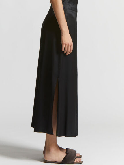 Made of viscose satin, this skirt features a shiny, light appearance with a touch of refined elegance.The design features side slits for movement, while the side zip fastening ensures a perfect fit.Id…