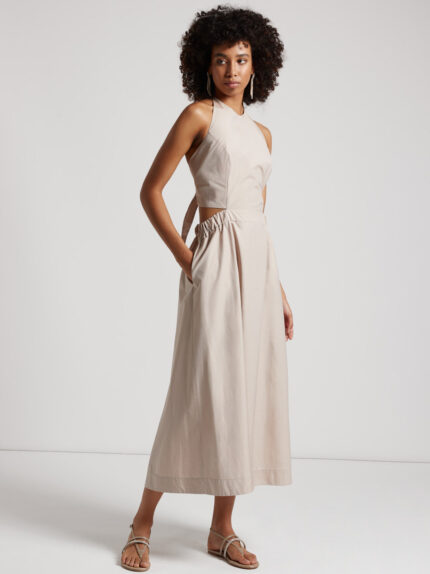 Made of a light technical parachute cotton, this long dress is characterised by its modern and sophisticated design.The cutaway armhole enhances the shoulders, while the crew neck is embellished with …