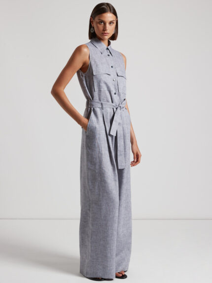 This jumpsuit in cool pure linen is a garment of absolute elegance and versatility. The cutaway armholes and shirt collar give the garment a refined and contemporary touch.Flap patch pockets on the ch…