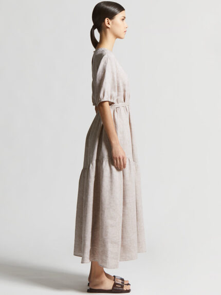Made of lightweight pure linen, this long dress is a refined and natural style choice. The garment features short sleeves gathered at the bottom, adding a romantic and feminine touch.The waist belt en…