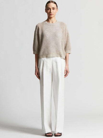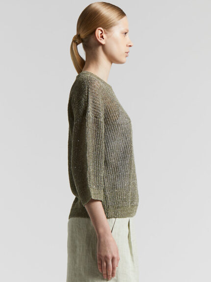 Perfect for warm weather, this crew neck sweater is made of cool, lightweight linen yarn.The cob-stitch knit conveys a rich, sophisticated texture, embellished with delicate sequins that catch and ref…
