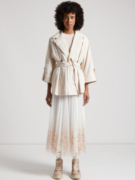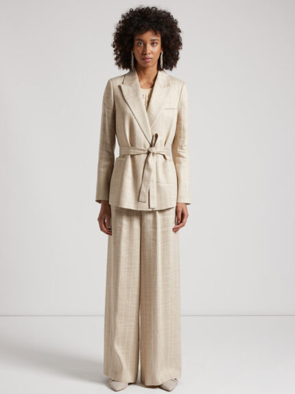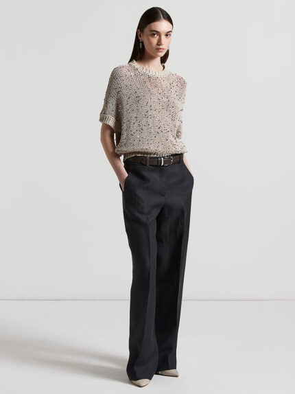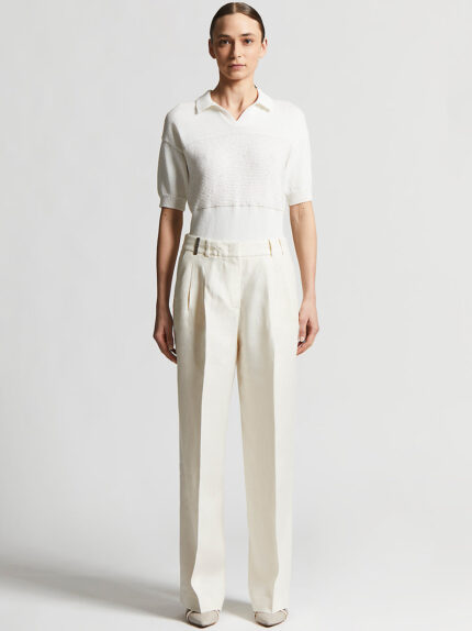 A perfect combination of class and modernity. These trousers with pleats, made of plain-coloured pure linen gabardine, expresses the sophistication of spring and summer.The impeccable cut is enhanced …