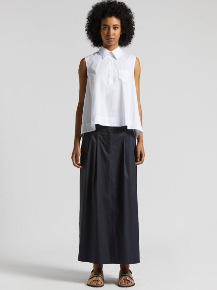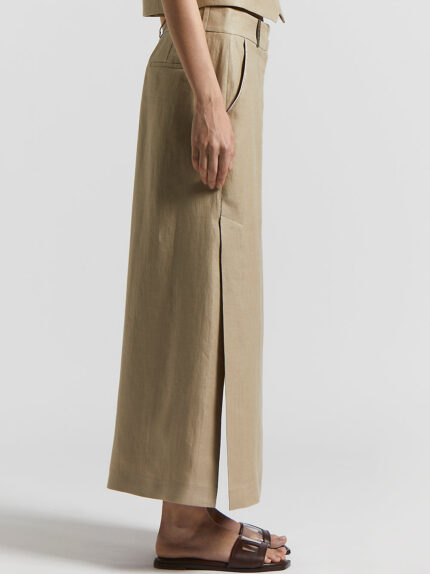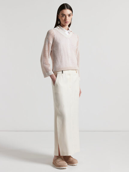 Thislong skirt in plain pure linen gabardinestands out for its unfussy, elegant design. The cool, breathable fabric offers a comfortable fit and a straight line that enhances the figure.Side slits and…