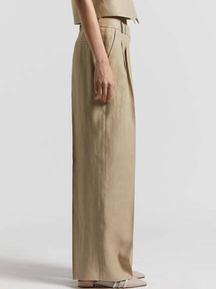 Timeless elegance characterises these pleated trousers, made of plain-coloured pure linen gabardine.The high waist and turn-up hem define a sleek silhouette, while the impeccable cut and natural fabri…