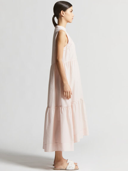This lightweight elegant pure cotton voile long dress delicately drapes the figure with a vaporous, airy effect. Featuring a sleeveless design and a mandarin collar, it presents ethereal and fresh aes…