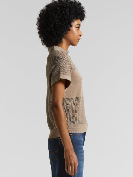 Made of fine cotton vanisè Lurex, this polo shirt features micro-mesh blocks that enhances its light and refined texture, embellished with a delicate sheen that artfully catches the eye.The buttonless…