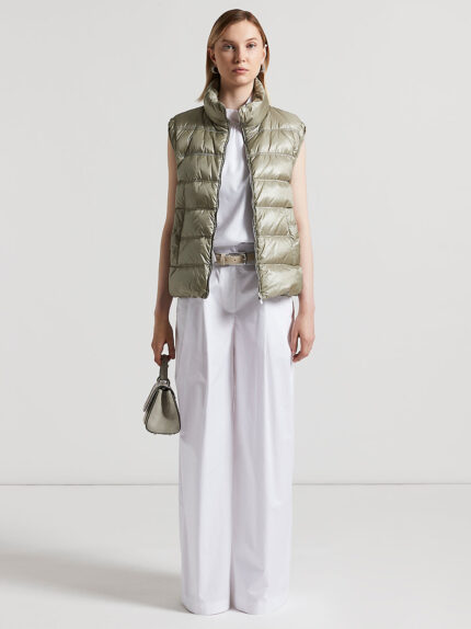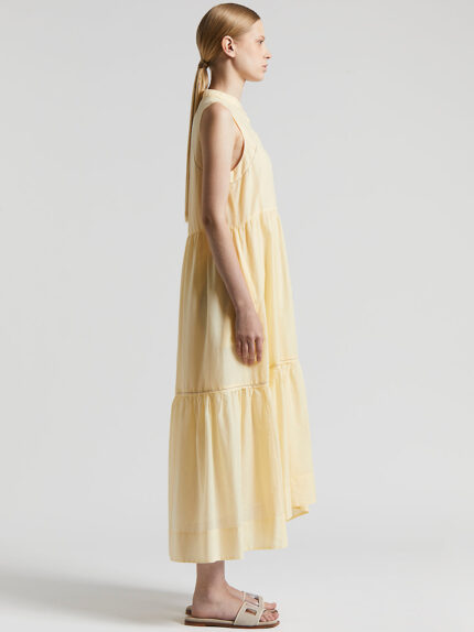This lightweight elegant pure cotton voile long dress delicately drapes the figure with a vaporous, airy effect. Featuring a sleeveless design and a mandarin collar, it presents ethereal and fresh aes…