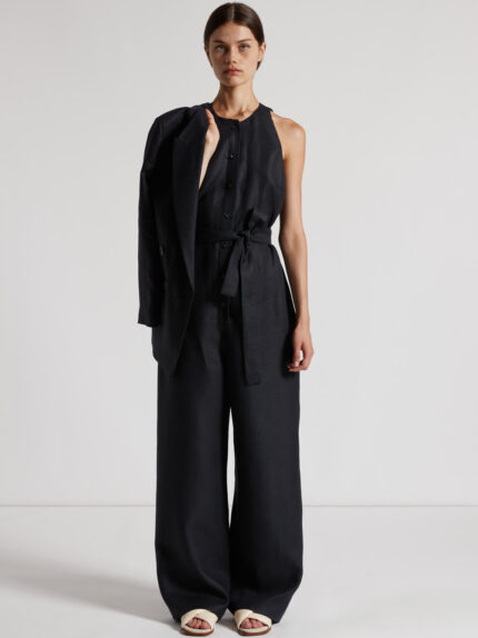 This jumpsuit in fine plain-coloured pure linen gabardine is the epitome of modern elegance and comfort. The wide round neckline and sleeveless design enhance the figure with sophistication.The front …