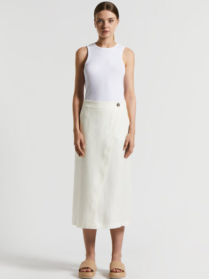 This wrap skirt in plain pure linen gabardine is an elegant and versatile garment that guarantees cool comfort.With its straight line and regular waist, this skirt offers an impeccable fit, while slas…