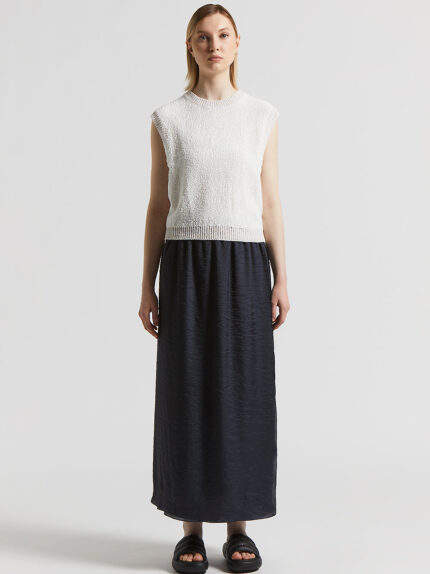 This long wet-effect fluid organza skirt merges elegance and comfort in a modern design. Featuring a side slit and an elasticated waist, it enhances the figure without forgoing comfort.This skirt is p…