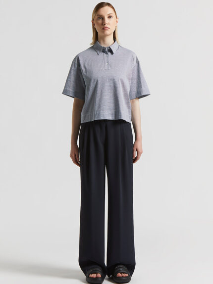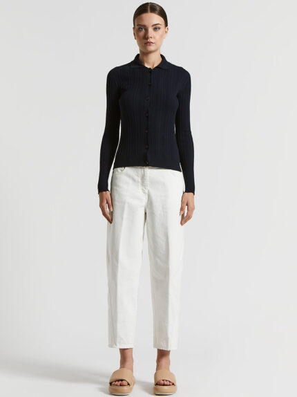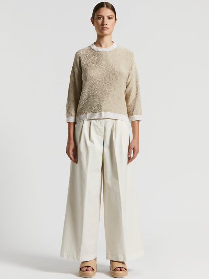 This crew neck sweater with three-quarter sleeves, made of pure cotton ribbon yarn, perfectly balances elegance and comfort.Knitted in purl stitch with a nubby effect that gives the garment a soft tou…