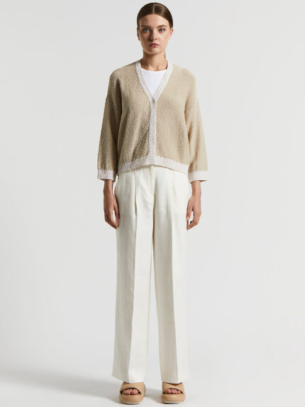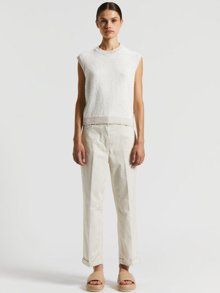 A top featuring unique details and elegance in pure cotton nubby ribbon embellished with cotton blend moulinè yarn trims with sequins that catch the light.Purl stitch with a nubby effect gives this to…