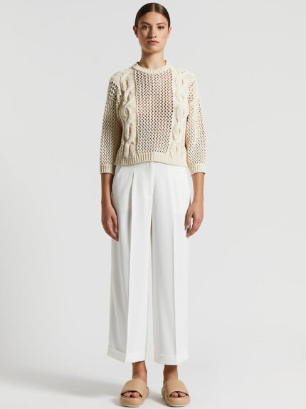 Made of pure cotton ribbon, this crew neck sweater stands out for its special openwork stitch embellished with elegant cable inserts.Perfect for spring, it combines a rich texture with a sophisticated…