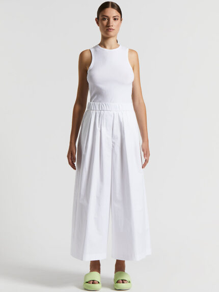 A perfect balance between fluidity and structure, these cropped trousers in smooth touch light stretch cotton satin combine the lightness of the fabric with the precision of the pleats.The flared line…