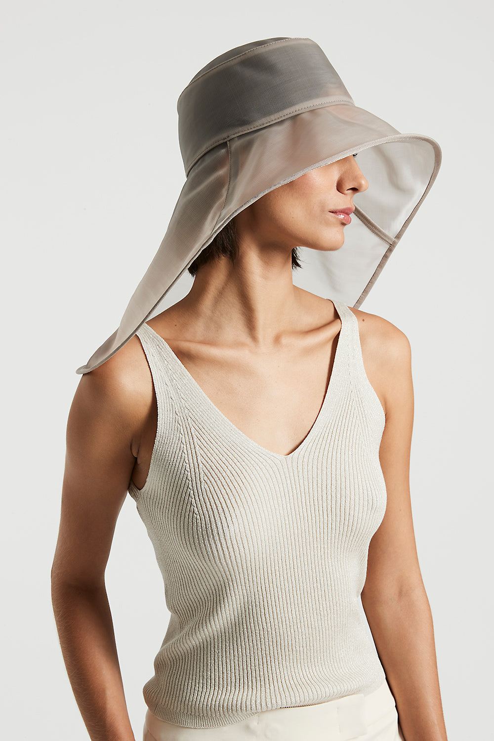 Peserico – Asymmetrical semi-transparent hat – Amber Beige