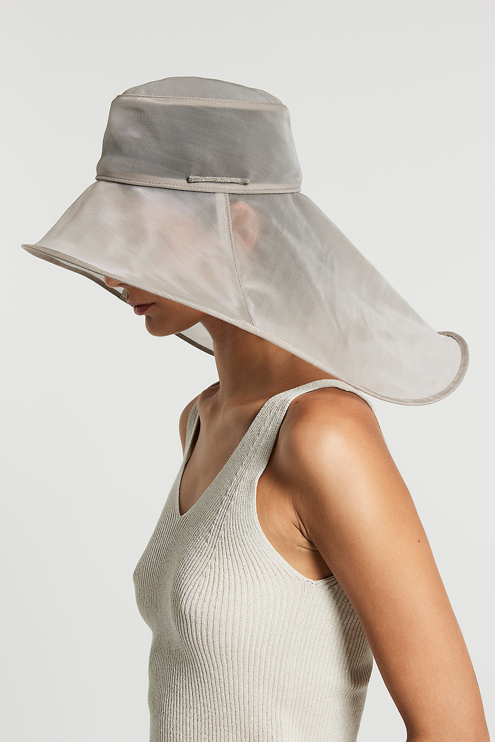 A perfect balance of lightness and character defines this asymmetric wide-brim hat enveloped in a refined play of transparency.