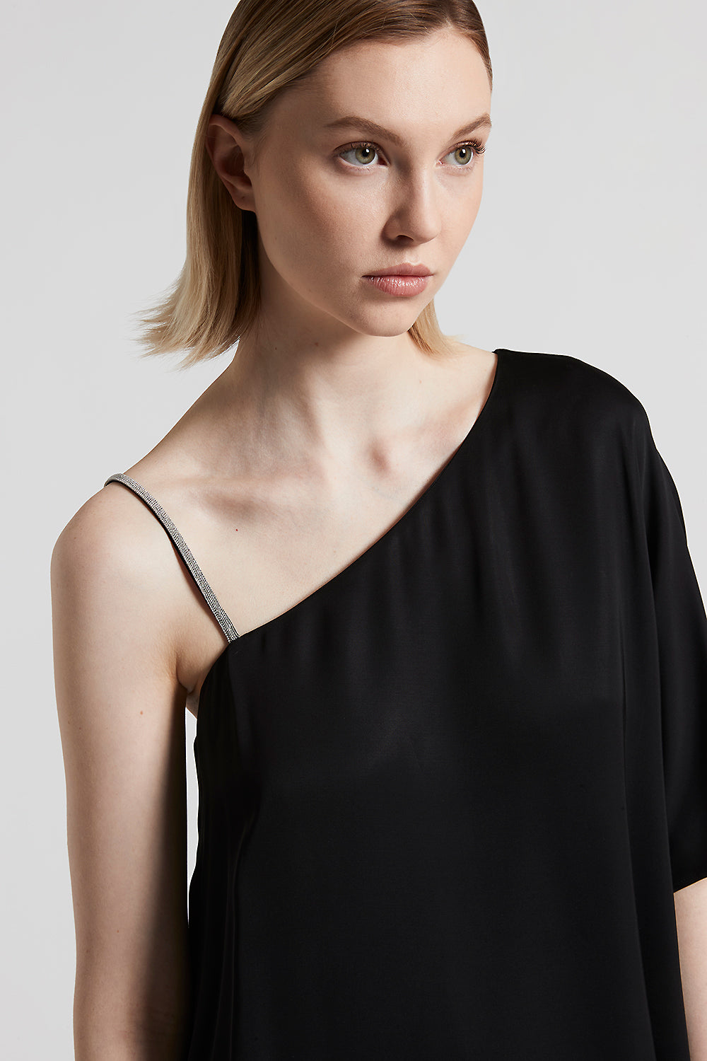 Made of flowing viscose satin, this one-shoulder top combines elegance and glamour. The shiny, soft fabric gives the garment a sophisticated look and a pleasant feel.The asymmetrical one-shoulder desi…