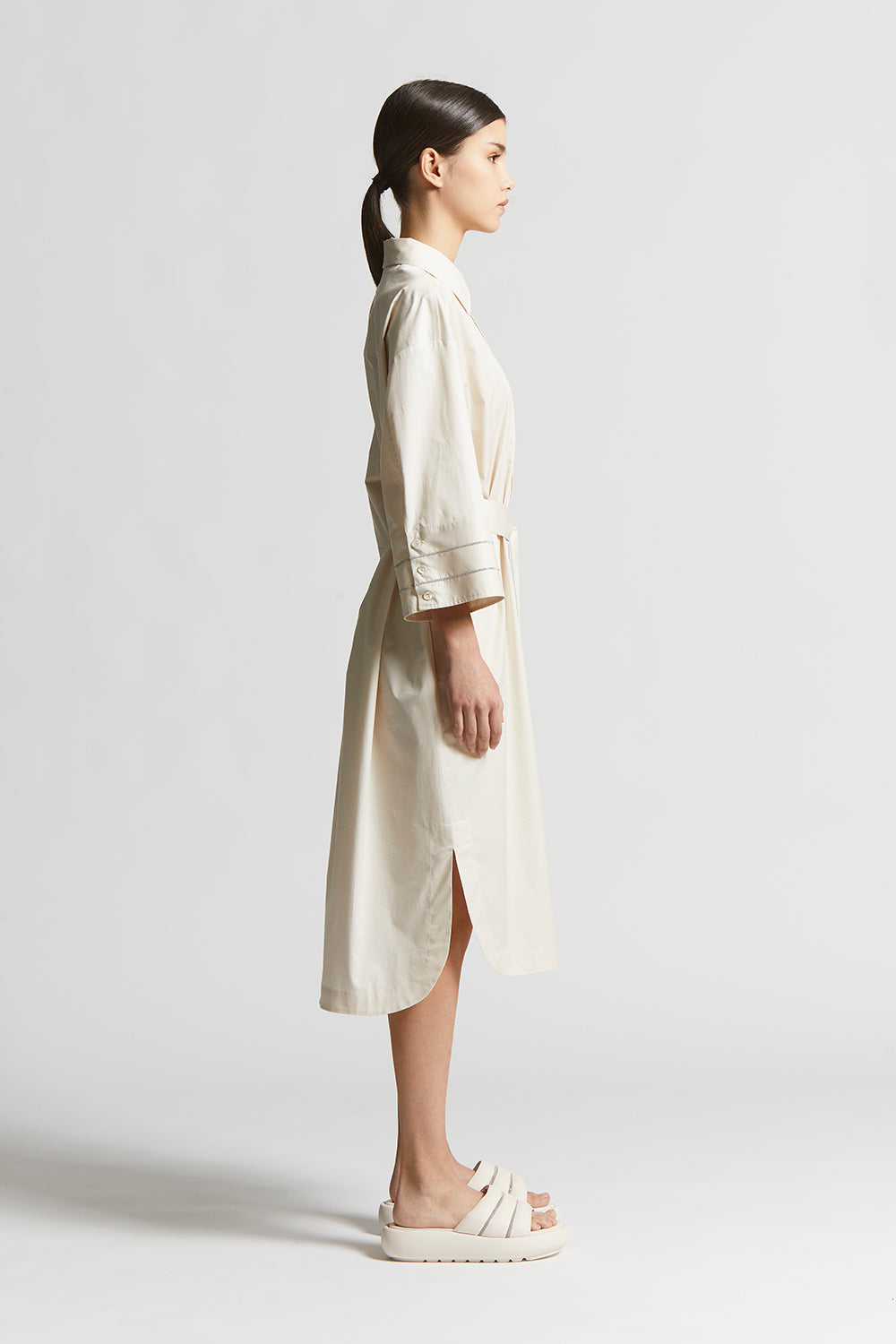 This soft touch light stretch cotton satin chemisier dress features a refined and contemporary style. The three quarter sleeves with cuffs convey a casual-chic look.