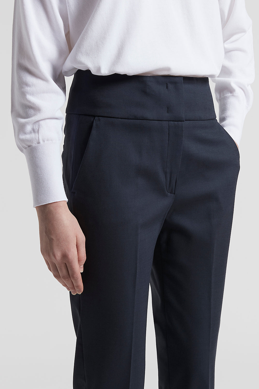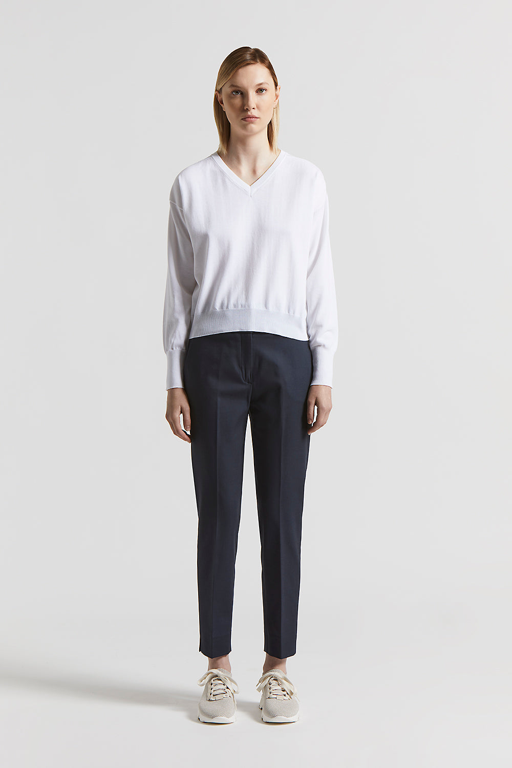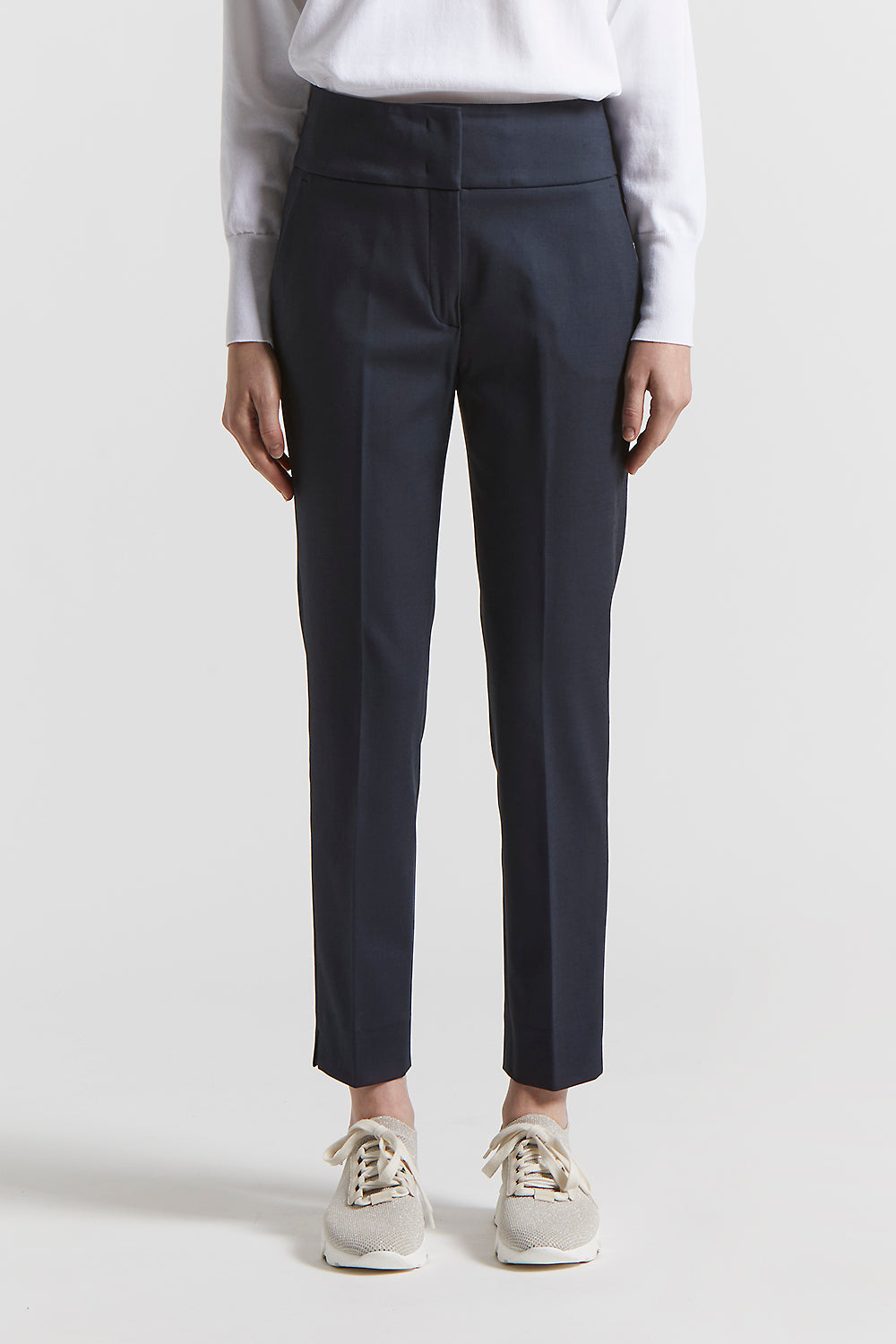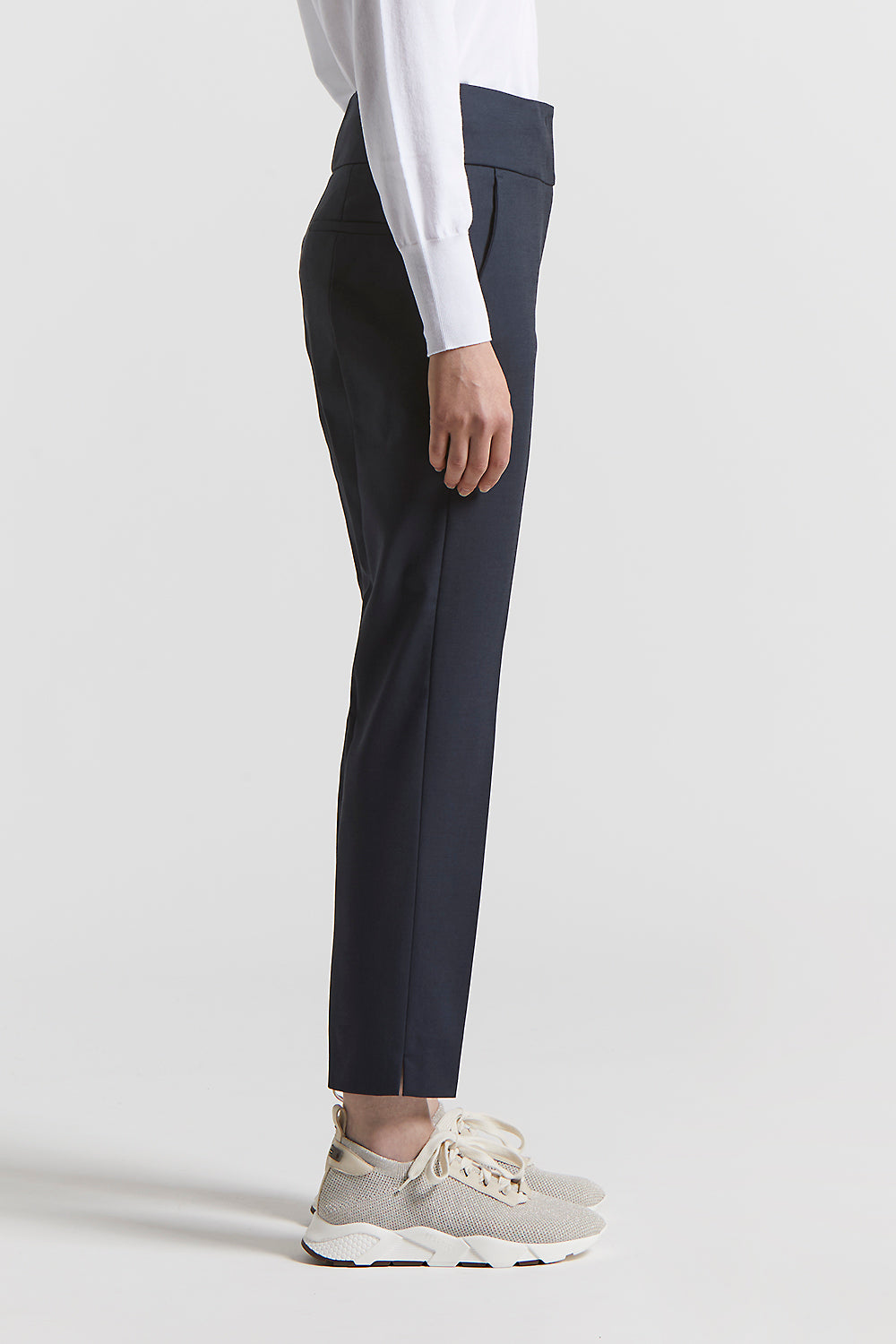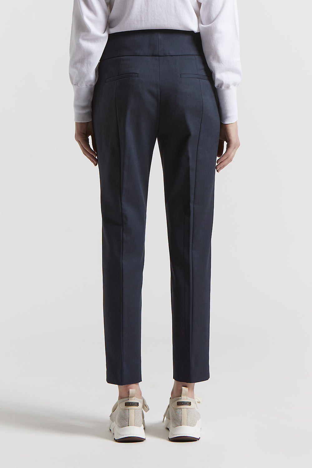 Trousers with a clean and sophisticated line, made of compact stretch cotton-viscose. The slim fit and the basque flatter the figure, the slits at the bottom enhance the garment with movement.