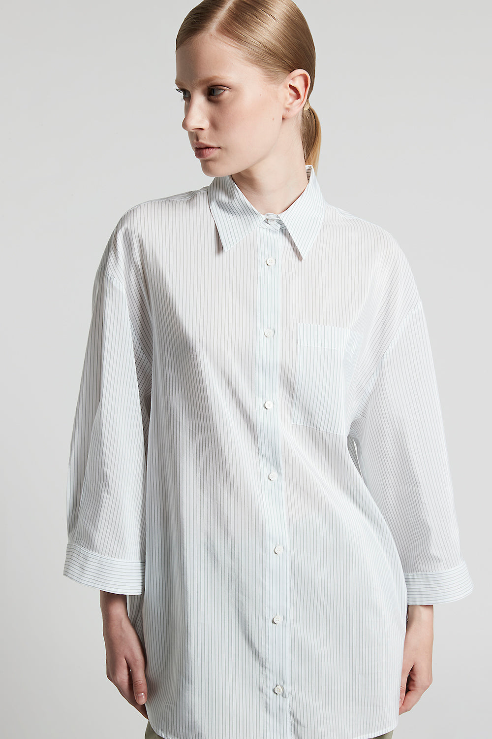 The Punto Luce detail on the cuffs and breast pocket add a touch of glamour, while the striped weave and three quarter length dropped sleeve give a contemporary style.