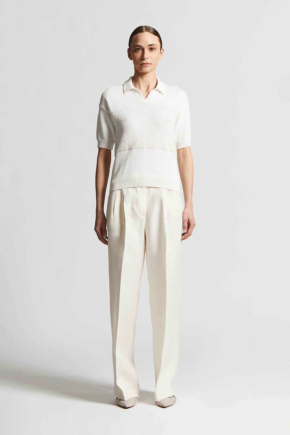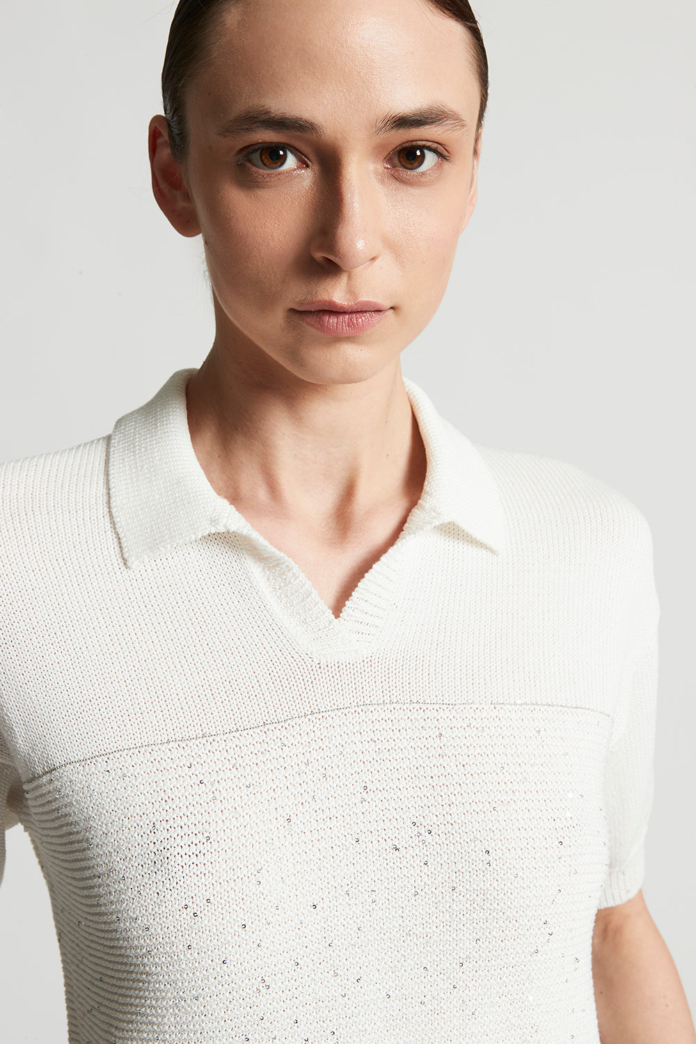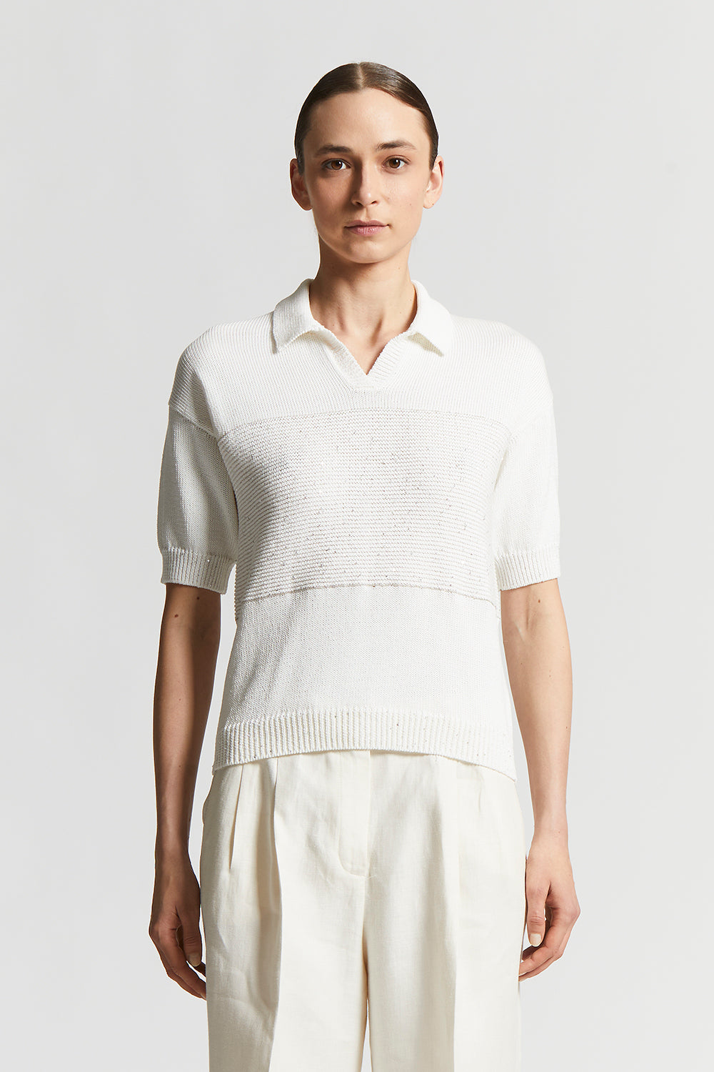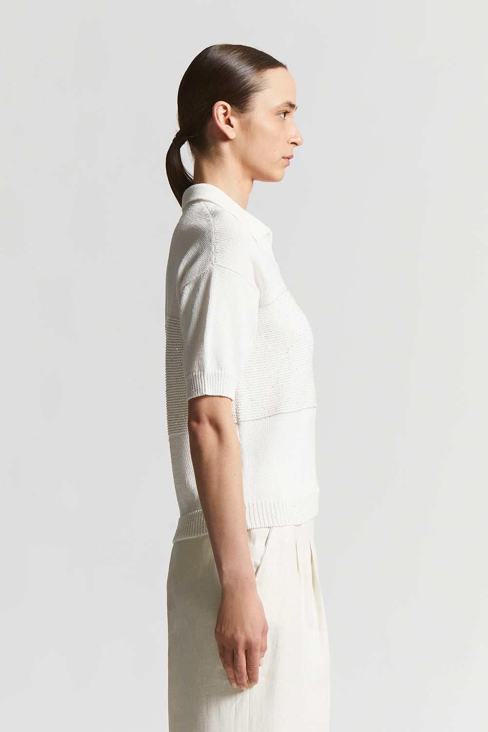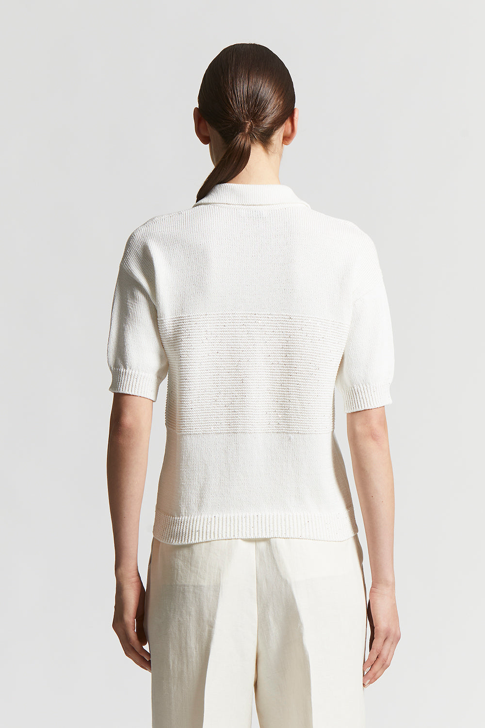 Made of fine mercerised pure cotton yarn, this tricot polo shirt embodies the essence of casual elegance and comfort.Stocking stitch with block of links stitch embellished with delicate sequins, decor…