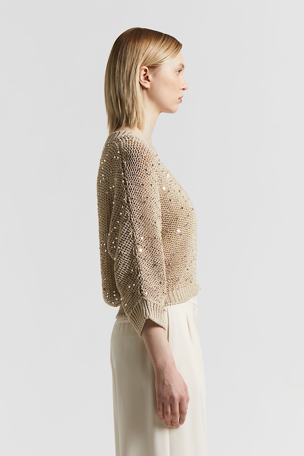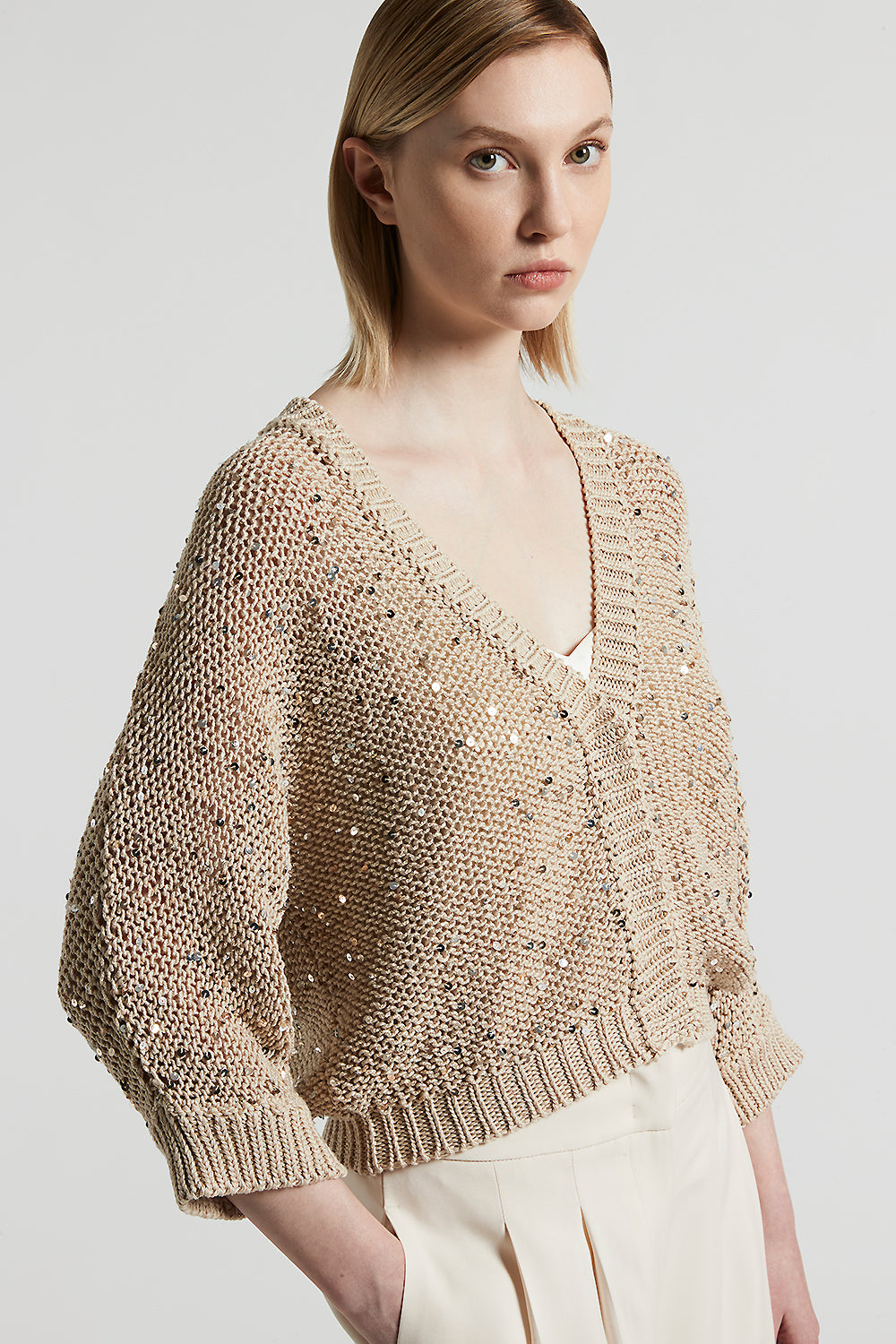 Made of fine cotton yarn, this cardigan with wide kimono sleeves is embellished with maxi sequins that create suggestive and feminine plays of light.